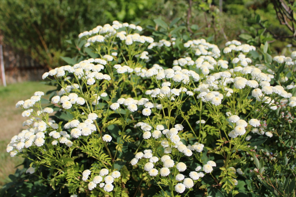 Feverfew ‘Pom Pom’, also known as Featherfew, Altamisa, fFatherfoil, Febrifuge plant, Midsummer daisy, Santa Maria, Wild Chamomile, Wild Quinine, Federfoy, Flirtwort, European Feverfew, Feather-fully, Feddygen, Flirtroot, and Grande Chamomile, is a perennial old cottage garden herb that forms mounds of ferny, light-green foliage and masses of dainty and cute, creamy-white, full pom pom shaped flower heads that bloom through the summer with more blooms in autumn. The foliage has a unique citrus and camphor scent that repels some insects like mosquitos and flies, while attracting others like hoverflies and butterflies. For this reason, it is sometimes planted as a deterrent-plant to ward off certain pests. Will grow just about anywhere in full sun to part shade. Long lasting and hardy in the garden.