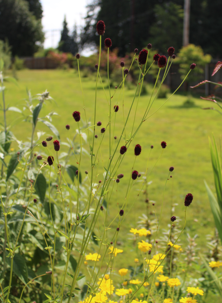 The leaves of Great Burnet are sometimes collected to use in salads, and they are reported to taste rather like cucumber. (Not to be confused with Salad Burnet Sanguisorba minor, which is a different plant that’s shorter and has less spectacular flowers.)