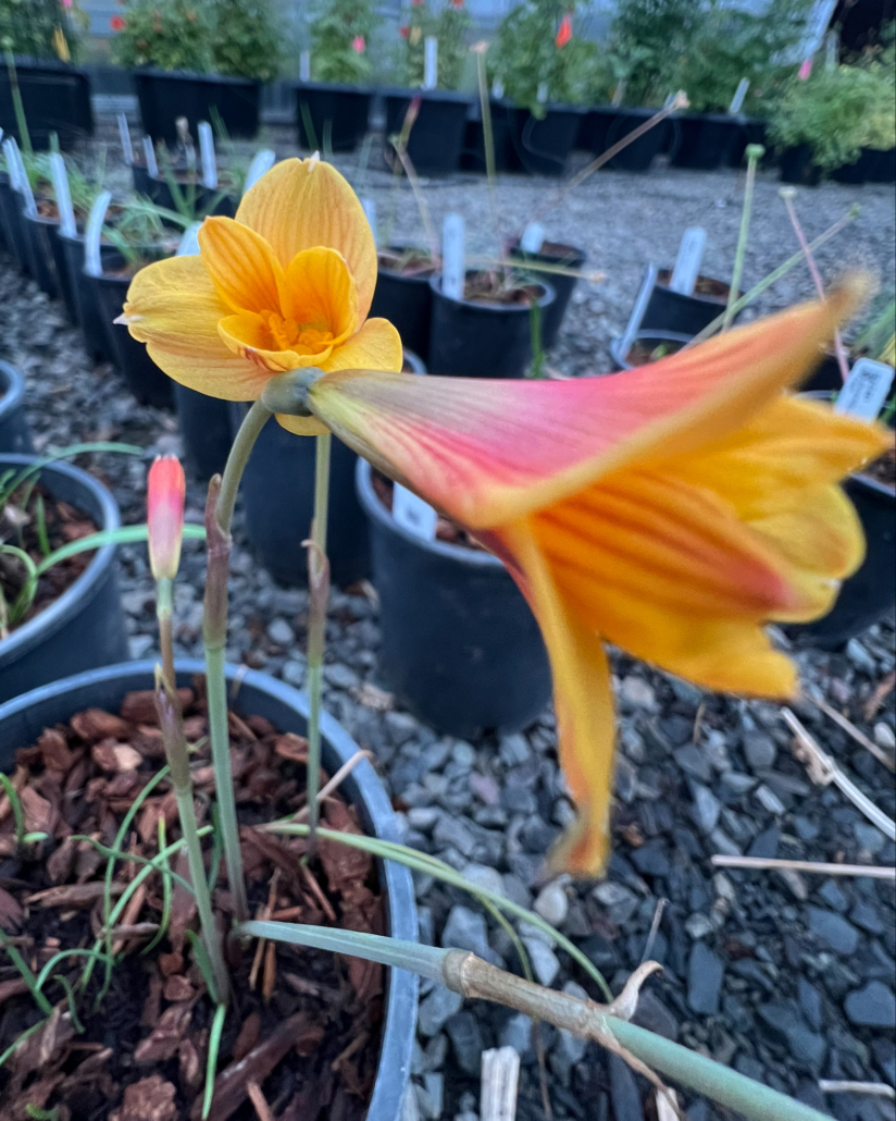 Rio Grande Copper Lily, also known as Barbados Snowdrop is native to southern South America and belongs to the rain lily family. It’s a perennial bulbous flower species in the Amaryllidaceae family known for crocus-like flowers that burst into life a couple days after a summer thunderstorm ends a period of dryer weather, sending up a solitary flower that as with all former Habranthus species, is not fully upright on the stem but held at a slight angle, and characterized by its bright yellow petals with copper tones on the outside and orange-red center. It’s narrow, linear, glossy leaves emerge after the flowers are finished.