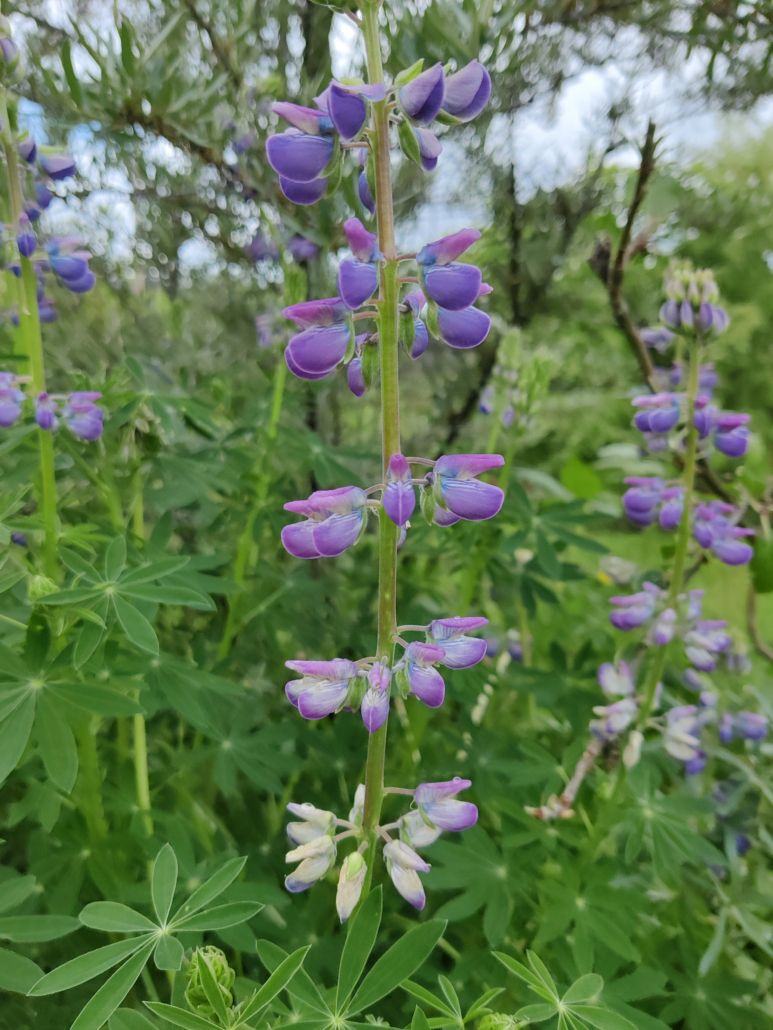 A Lupine with a spreading shrubby habit that stays evergreen throughout the winter. Grows 3 ft x 3 ft. The flowers are a beautiful Lupine-blue with a white keel that erupt in late April through early July. Very pretty when in bloom and is a very important plant for the pollinators and other insects who feast on its flowers and leaves.