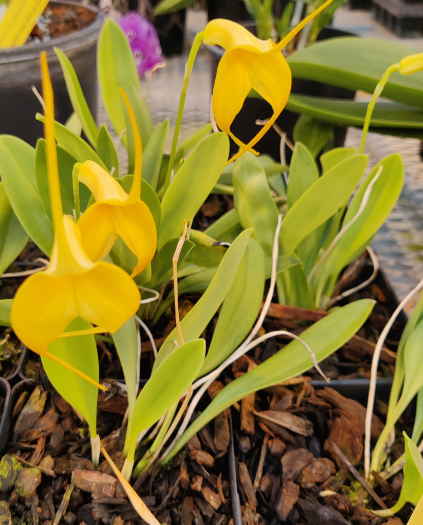 Masdevallia orchids prefer cool, moist, and shaded environments around 55-60F nights and 70-75F days and should be watered frequently as they don’t have pseudobulbs for water storage and tend to dry out fairly quickly, so be sure to not let your ‘Golden Butterfly’ dry out completely while also not over-watering it.