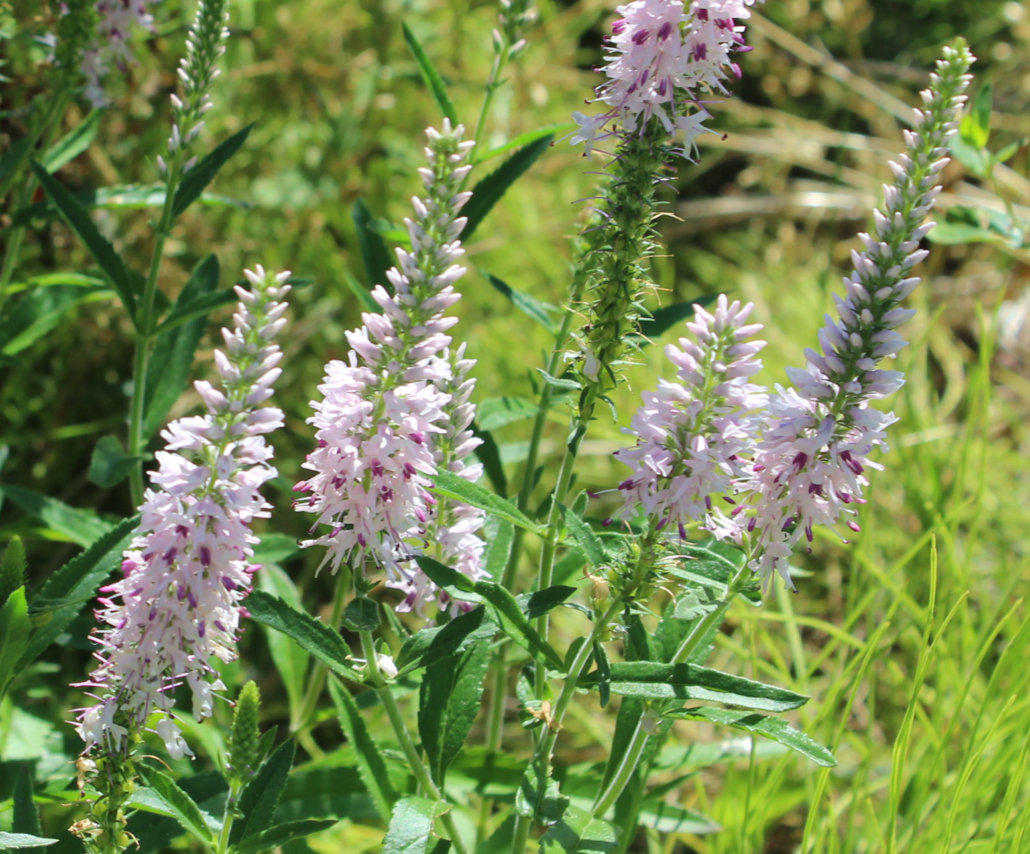 Long-leaf speedwell, sometimes called Garden Speedwell, is an upright, herbaceous perennial that forms a low mound of attractive lance-shaped green leaves with upright stems bearing numerous tall, tapered spikes lightly-blushed white flowers that rise well above the foliage. The showy flowers reach up to 14 inches tall and typically bloom from June to August. They are attractive to bees and butterflies.